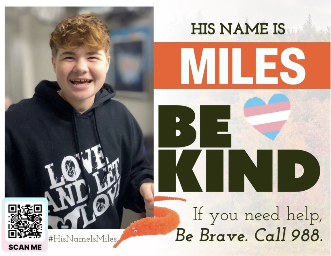 In November of 2025 my son Miles Phipps took his life after being bullied relentlessly for years over being different. The day after a teacher refused to use his legally accepted pronouns. He was only 15 years old. Miles was nothing ever than completely himself. He was transgender, but he was so much more. He was funny, intelligent, empathetic and kind.